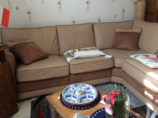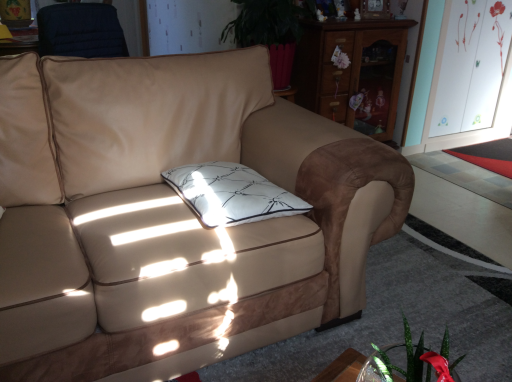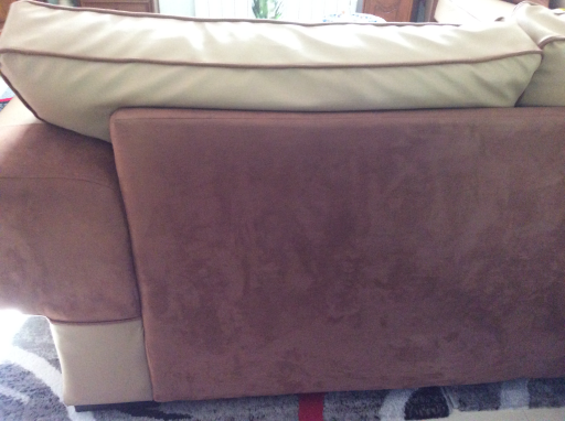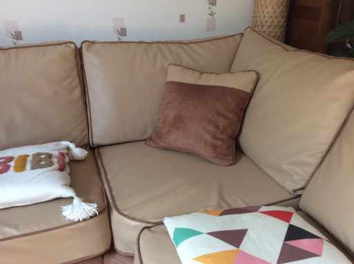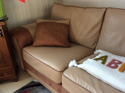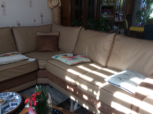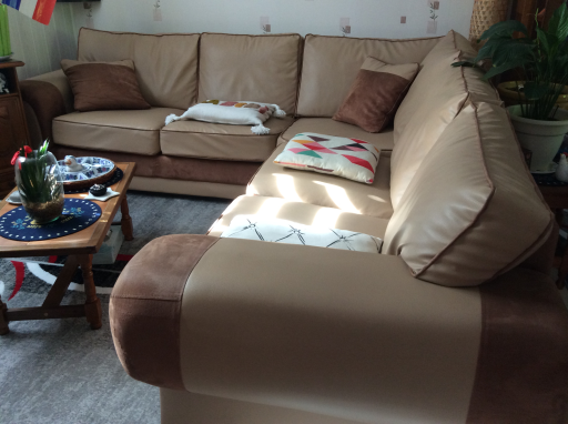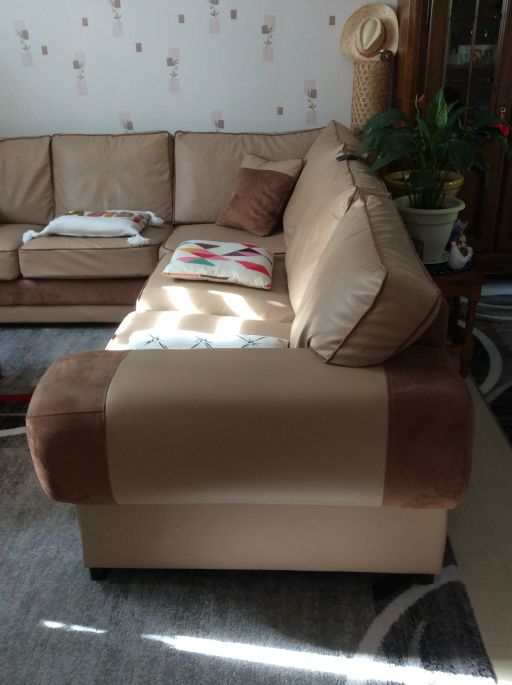 Très joli et spacieux canapé d'angle, non convertible, en simili cuir et suédine, coloris beige et marron. Il est composé de 2 morceaux. Pouvant recevoir facilement 8 personnes. Il est composé de 5 coussins pour l'assise et de 6 coussins pour le dossier. 2 coussins style oreiller le complètent. Ces coussins sont rempli de plaque de mousse, ils sont totalement déhoussables, lavables en machine au cycle froid ou à l'éponge pour un entretien courant. La longueur du pourtour avec accoudoirs est de près de 5 mètres sur 0.96 de profondeur et 0.90 de hauteur. 2 coussins font la longueur de 1.35 m et 0.35 m de large pour chaque accoudoir. A voir et à prendre uniquement sur place.