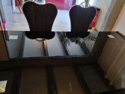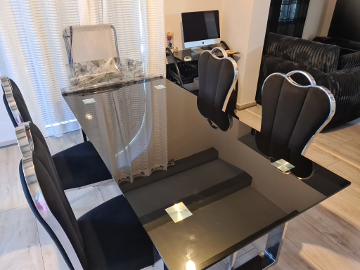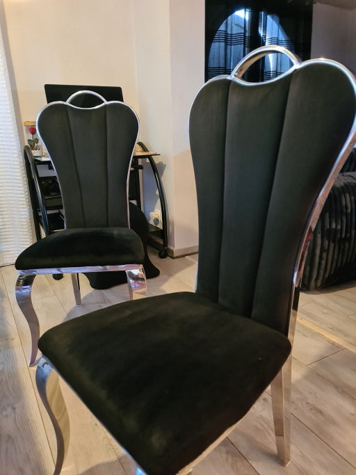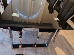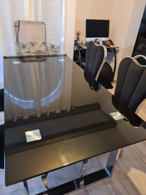 Vends un ensemble composé d'une table et 4 chaises. La table est en verre tremper, de couleur noir avec pied en inox