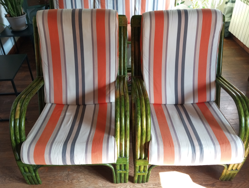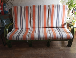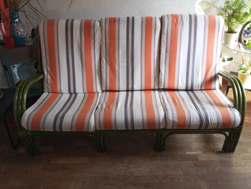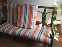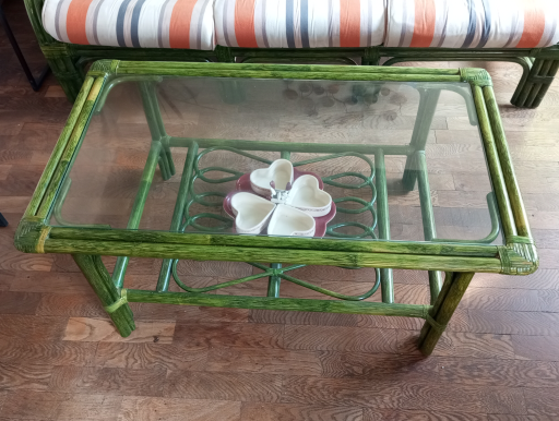 Canape 3 places 2 fauteuils et une table basse dessus verre, en rotin vert.Bon etat