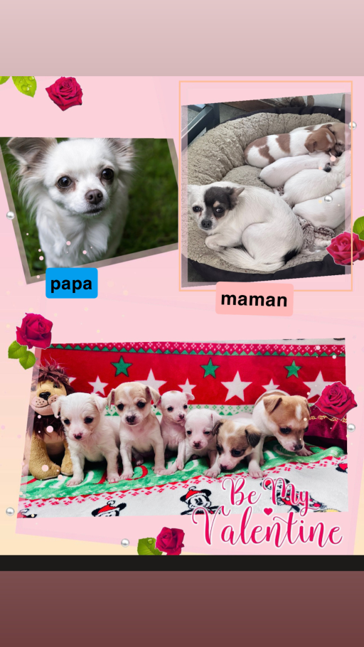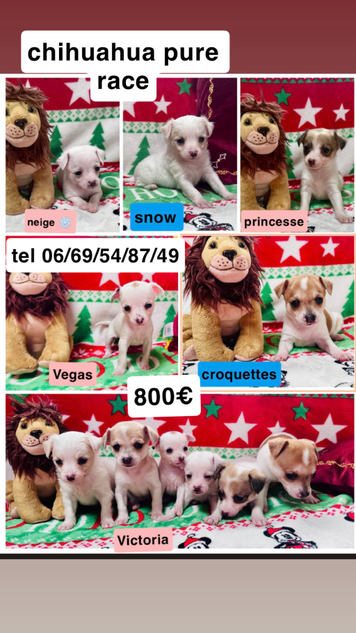 Nous proposons à la vente d'adorables chiots chihuahuas prêts à rejoindre leur nouvelle famille. Ils sont vaccinés, vermifugés et élevés en famille, ce qui les rend très sociables et affectueux. Nos chiots chihuahuas présentent une belle variété de couleurs et sont dotés d'un excellent pedigree. Parfaits compagnons à poils, ils sauront vous apporter amour et joie au quotidien. Contactez-nous pour plus d'informations et pour organiser une visite.