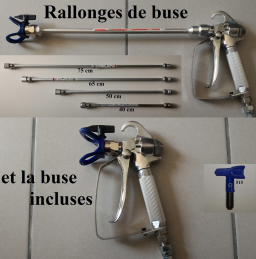 Sont également fournis en plus du reste, 2 clés plates et des rallonges de buse de différentes longueurs (40, 50, 65 et 75 cm) qui permettent de peindre plus facilement un plafond ou le sol, et je vous expliquerais en détail le fonctionnement du matériel.