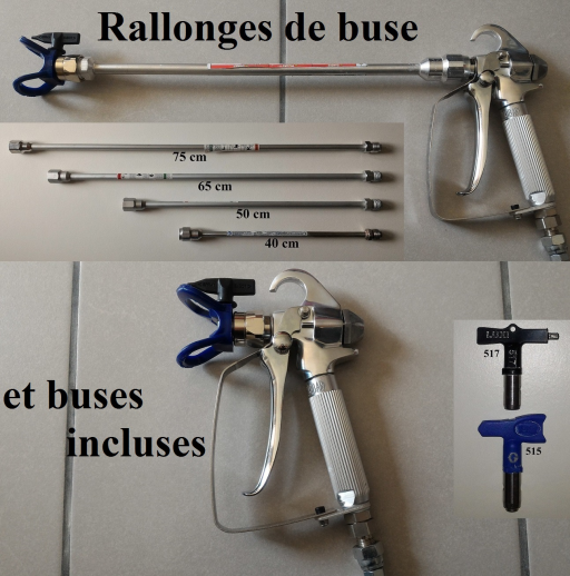 Sont également fournis en plus du reste, 2 clés plates et des rallonges de buse de différentes longueurs (40, 50, 65 et 75 cm) qui permettent de peindre plus facilement un plafond ou le sol, et je vous expliquerais en détail le fonctionnement du matériel.