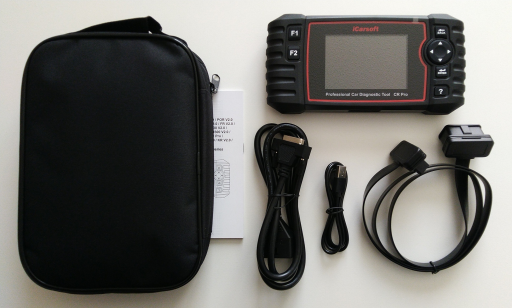 Fournie avec un câble OBD2 de 1,20 mètre pour connexion au véhicule à diagnostiquer, une rallonge de câble OBD2 de 1 mètre, une sacoche de transport et une notice d'utilisation en français.
