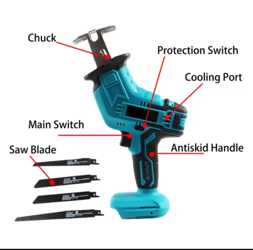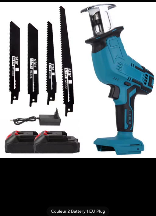- Accessoires inclus : 2 batteries, 1 chargeur, 4 lames de scie
