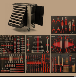 L'outil est en acier au chrome vanadium de qualité supérieure. Inserts d'outils de qualité supérieure en mousse flexible Sur le dessus se trouve une étagère en acier inoxydable