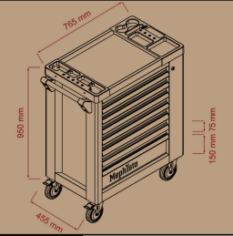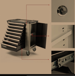 7 tiroirs coulissants avec extension complète (dimensions extérieures : 550 x 400 x 75 mm). 1 grand tiroir à extension complète (dimensions extérieures : 550 x 400 x 150 mm). 1 compartiment latéral avec étagère et porte verrouillable (vantail renforcé et donc stabilisé contre les charges latérales). Un panier indéformable suspendu dans le compartiment latéral pour "petites pièces"