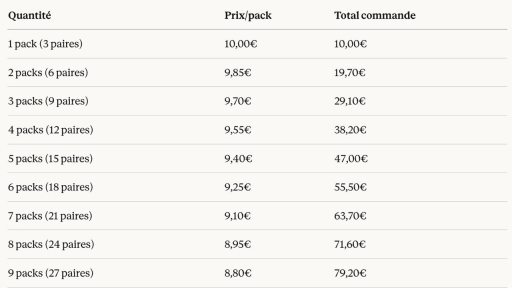 • 3 packs (9 paires) → 27,99€ (soit 9,33€/pack)