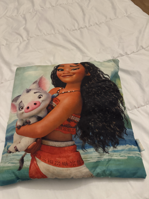 Coussin pour fille à l'effigie du personnage Vaiana. Idéal pour décorer la chambre ou pour ajouter du confort à une prestation de détente pour enfant. En excellent état et très confortable, il apportera une touche d'aventure et de couleur à la chambre de votre enfant.