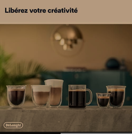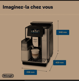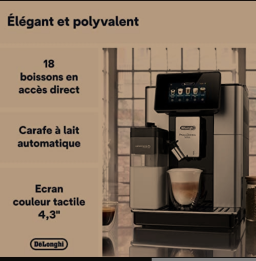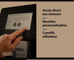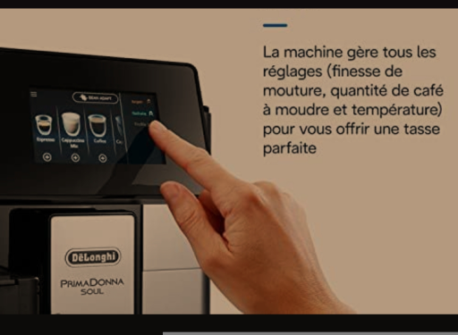De'Longhi PrimaDonna Soul ECAM612.55SB : Expresso broyeur avec nouvelle technologie Bean Adapt ajuste la finesse de mouture idéale au café en grains utilisé. Pour tous les typicités de café, Bean Adapt va régler spécifiquement le moulin et les paramètres d’extraction pour toujours offrir un résultat en tasse qui retranscrit l’origine, le terroir et la torréfaction de votre café pour une tasse riche en arômes. Optimisez ce résultat en tasse via l’application Coffee Link « Bean system » en quelques clics. ECRAN COULEUR TACTILE TFT 4 3 ET CONNECTIVITE: Une utilisation toujours plus confortable pour personnaliser, modifier et profiter de sa machine au quotidien. Grâce à son application entièrement dédiée à l’utilisation de votre machine, personnalisez vos boissons à l’infini, créez vos propres boissons, bénéficiez de conseils d’utilisation et réalisez tous vos réglages et opérations d’entretien facilement. UTILISATION UNIVERSELLE: 3 modes d’utilisation direct, personnalisé ou profil permettent à tous les utilisateurs d’accéder en un geste aux boissons pré enregistrées ou aux personnalisations les plus poussées 3 profils utilisateurs sont paramétrables 1 profil invités. LA PLUS LARGE GAMME DE BOISSONS CAFÉ LACTEES: De l’espresso au cappuccino parfait découvrez de nouvelles saveurs et des recettes exclusives Personnalisez chaque boisson à l’infini selon vos préférences 18 boissons disponibles dont 1 inédite La recette du Cortado.