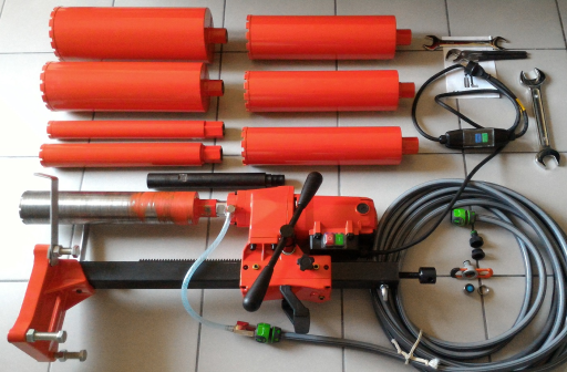 Loue carrotteuse diamant sur bati à eau appelée aussi carottier, foreuse diamant sur colonne, carotteuse béton sur colonne, carotteuse diamant électrique sur colonne ou foreuse béton électrique sur colonne.