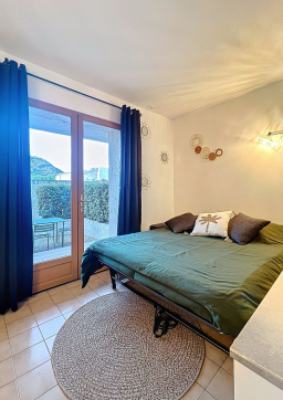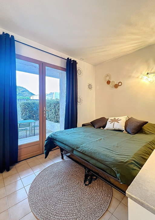 L'espace principal se compose d'un coin cuisine entièrement équipé et fonctionnel ouvert sur un Salon/séjour lumineux et accueillant aménagé avec un espace repas ainsi qu'un canapé convertible et téléviseur.