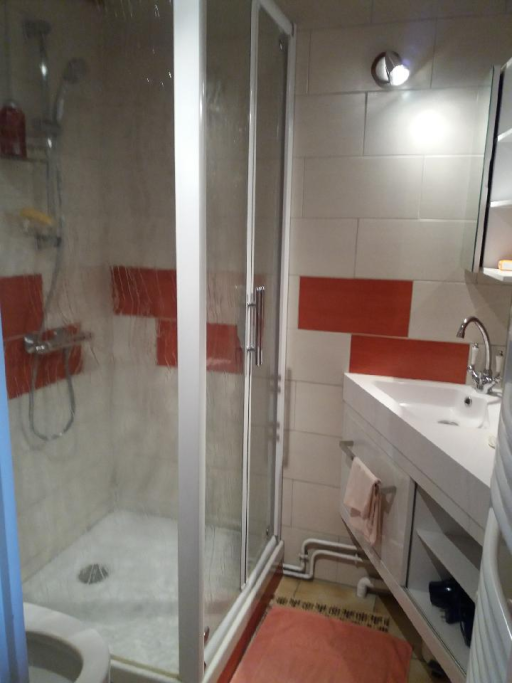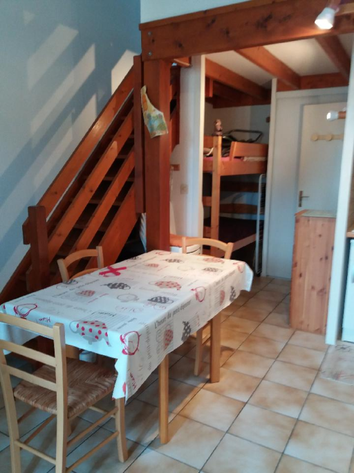 Maison 2 pièces 31m2, séjour avec télévision, canapé BZ et lits superposés, coin cuisine (2 plaque de cuisson, four, et micro-ondes et lave-linge), douche et WC. A l'étage une chambre avec un lit de 140cm.
