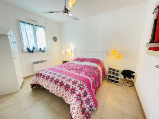 L'espace nuit se compose de deux chambres doubles confortables, chacune équipée d'un ventilateur en plafonnier et de placards de rangement, offrant un cadre reposant pour des nuits paisibles.