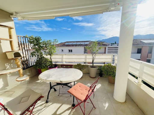 Le séjour climatisé donne accès direct à une terrasse de 11 m², véritable prolongement de l'espace intérieur. Vous pourrez profiter d'un café au lever du jour et vous détendre tout en profitant d'une vue apaisante sur les jardins de la résidence et les montagnes environnantes.
