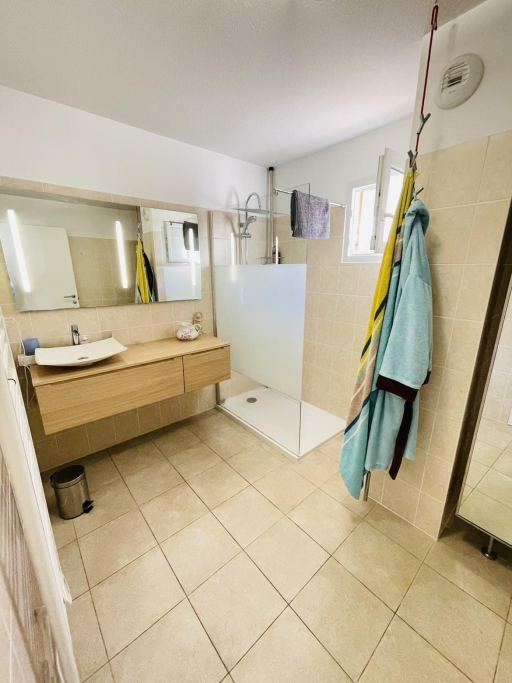 Une grande salle d'eau moderne avec douche à l'italienne et des WC indépendants complètent l'ensemble