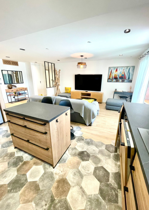 La cuisine ouverte, moderne et fonctionnelle, est dotée de nombreux rangements, d’un îlot central avec tabourets idéal pour les petits-déjeuners ou apéritifs, et de tout l’équipement nécessaire pour cuisiner comme à la maison. Le contraste entre le sol imitation parquet et les carreaux graphiques de la cuisine apporte beaucoup de caractère à l’ensemble