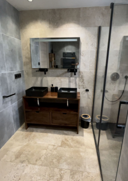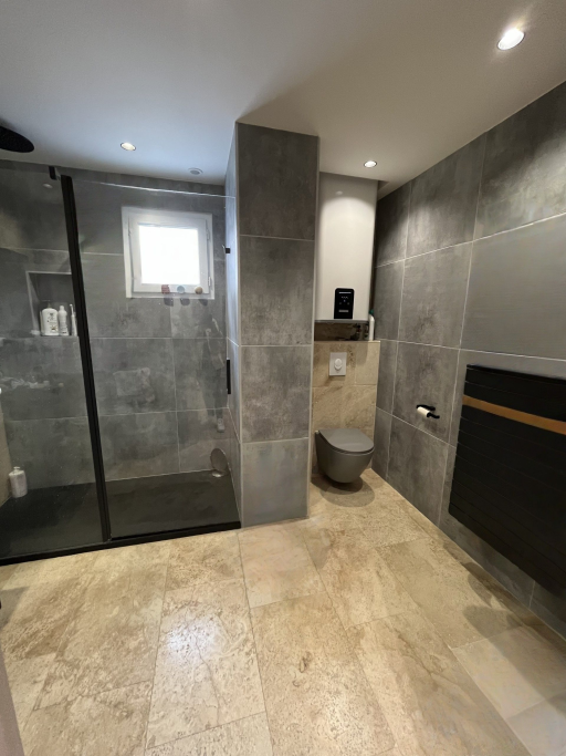 Une grande salle d'eau avec double vasque, douche à l'italienne et WC complète l'espace.