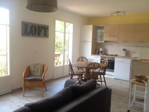 Vous disposerez d'une agréable pièce de vie avec, d'un coté, le coin repas aménagée avec cuisine entièrement équipée et de l'autre, l'espace séjour pour vos moments de détente.