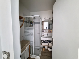 Coté nuit, une chambre avec rangement et une salle d'eau avec wc.