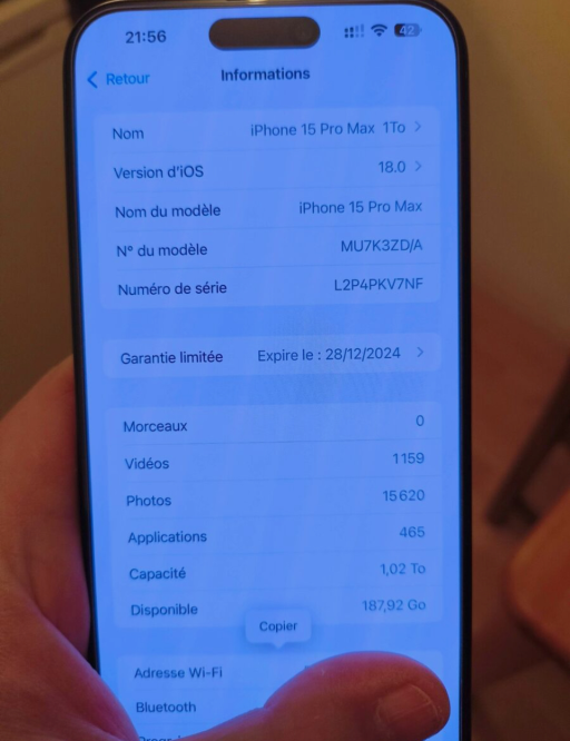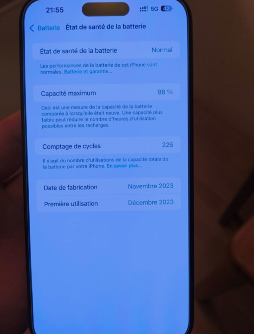 Je revend mon Iphone 15 PM 1To titane bleu acheté le 28 dec 2023 sur l’applestore en ligne , avec protection d’ecran Spigen EZ fit . Mon petit plaisir est de changer chaque année de pro max , je suis mega précautionneux surtout avec tout ce qui est Apple vu le prix Coque et protection ecran. mise des la 1ere heure ou je l'ai eu , donc pas de pets ou rayures du tout .