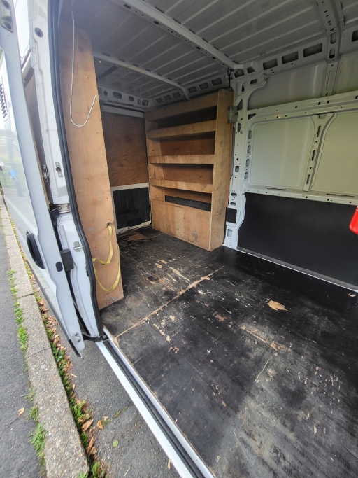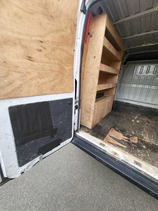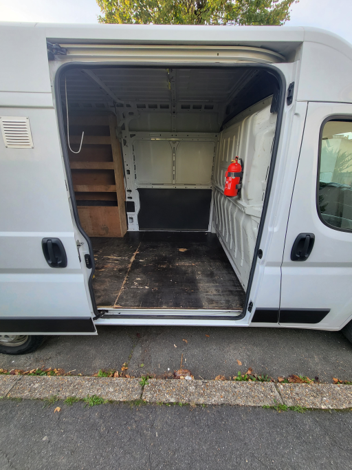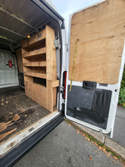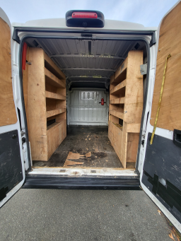 Véhicule équipé d'un intérieur bois (plancher + meubles gauche et droit, avec casiers et sangles) et d'une serrure de sécurité sur les portes AR et la porte latérale.