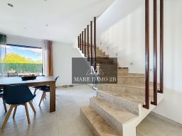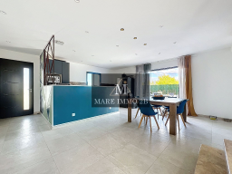 L’entrée donne sur un vaste et lumineux espace de vie. Le salon et la salle à manger bien définis. La cuisine ouverte est entièrement aménagée et semi équipée.