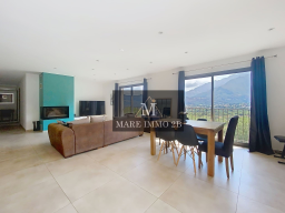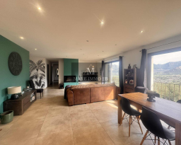 Dès l'entrée, vous serez séduit par la spacieuse et lumineuse pièce de vie. Le salon-salle à manger avec cuisine ouverte bénéficie de belles prestations et d'une vue imprenable sur les montagnes et les villages environnants.